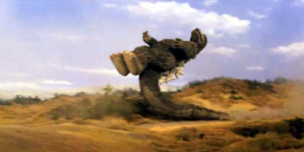 Still, when enjoyed as the childish, campy nonsense it obviously is, the climactic skirmish is goofy fun with Godzilla employing a succession of physics defying long range dropkicks thanks to a black belt in wire-fu and Gigan and Megalon enjoying the devastation they’re causing like a couple of overexcited frat boys.