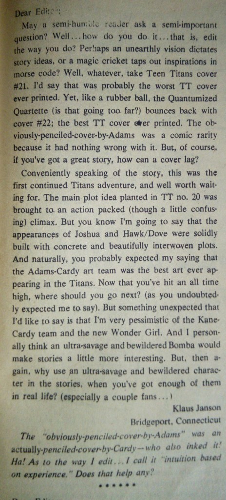 There is also this letter in the back that has been sent in by Klaus Janson who went on to work in the comic book industry and was the inker on the classic Dark Knight Returns.