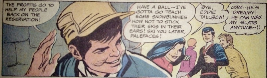 While on a ski trip to the native American owned Medicine Mountain resort the Teen Titans find themselves investigating the mysterious disappearance of the local ski instructor’s class. Aided by the ski instructor, Eddie Tallbow, the team discover the events are being orchestrated by Anson Larson, a restaurant owner who is chief creditor of the resort, intends to sell the land to the government for use as a missile site after the owners declare bankruptcy. After being defeated and captured our young heroes narrowly escape death while strapped into a runaway bobsled before turning the tables on Larson and his gang.