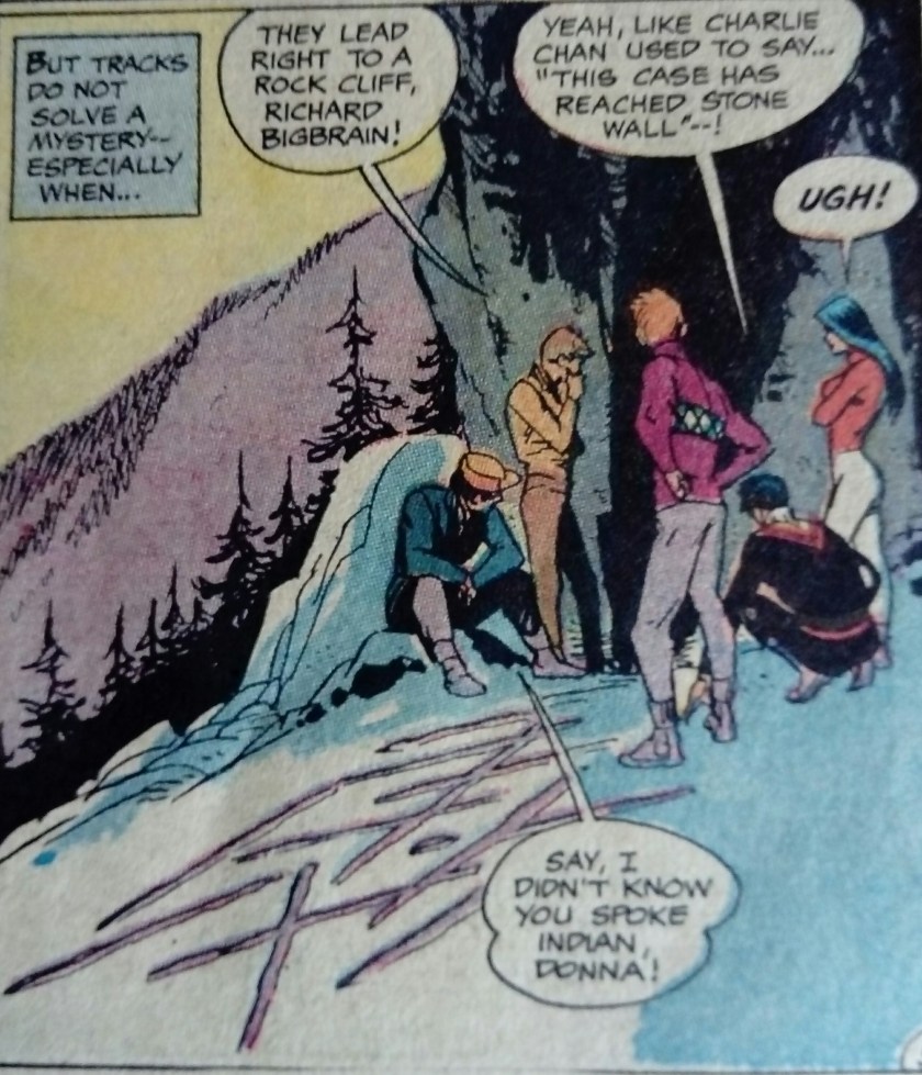 As comics tend to do, this issues sets out to tackle social issues but it is all done heavy-handedly. The Native Americans are referred to as ‘Indians’, ‘Injuns’ and ‘Redskins’ and they call the Titans ‘palefaces’. There is a lot of casual racism thrown about but the locals aren’t portrayed as weak and help to save the day.