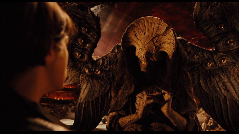 EVERY character has something going on be it lumbering blue hench-troll Mr. Wink, the melodramatic tooth fairies, or the genuinely haunting spectre of Death with it’s ritcus grin and eyeball encrusted wings and EVERY creature has a separate personality, even the huge Godzilla sized Forest God qho puts the mental in Elemental. Multiple viewing are required, nay, demanded, to soak up all the luscious detail Del Toro infuses with every frame.