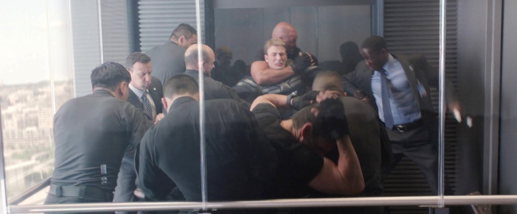 During Captain America: Winter Soldier Cap uncovers a H.Y.D.R.A. conspiracy inside S.H.I.E.L.D and is attempting to leave the headquarters quietly. He enters a glass elevator on the outside of the building and one by one the H.Y.D.R.A. strike team get in with him. Steve politely asks if anyone wants to get out and when they attack he beats them senseless.