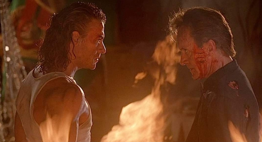 Another place where Hard Target scores big is in it’s villian department with quintessential 90’s villain Lance Henricksen going above and beyond the call of duty with his snarling Fouchon and at one point is actually set on FIRE for REALSIES while screaming commands at his subordinates as flames visibly lick the back of his neck. Unable to match JCVD’s flurry of kicks, Henricksen employs a deranged, iron will – pushing himself and his large amount of employees endlessly forward into certain death (Where is he getting the money from to hire all these guys? I bet a tenner they don’t have dental.) and manages to be a credible threat by sheer insane bluster alone. Countering this maelstrom of teeth-baring villainy is The Mummy himself, Arnold Vosloo as the MUCH more reserved henchman who engages in a duel of opposing accents with our hero as his soft, smooth South African drawl goes head to head with Van Damme’s trademark butchering of the english language. In comparison, all heroine Yancy Butler is called on to do is look confused and duck during the gonzo climax when the bullets start to fall like hail.