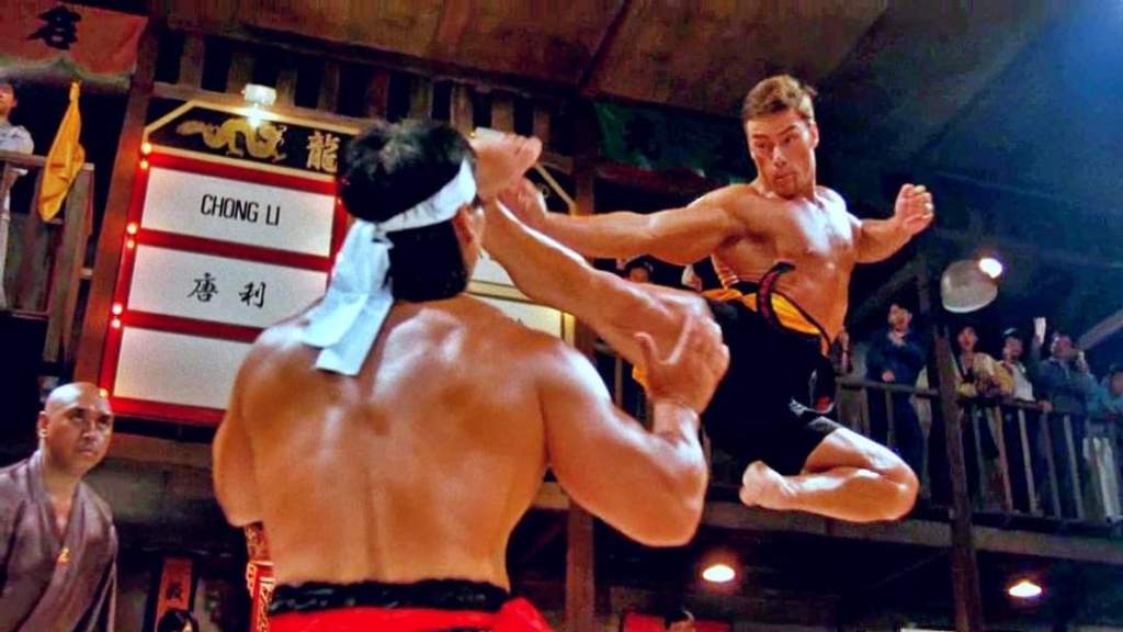 “American” soldier Frank Dux decides to go AWOL, suit up in an upsetting fashion combo of low cut muscle shirt and a very high trouser line and head off to Hong Kong to participate in a secret martial arts tournament that everybody seems to know about. There he bonds with the guy who played the bully in Revenge Of The Nerds, a fellow fighter whose special abilities seem to be that he’s just a thug with a weakness for Harley Davidson apparel, and the two sign up a prepare to do battle. Dux’s whole reason for entering is to avenge the death of his mentor’s son in the tournament a year earlier at the hands of the mountainous Chong Li (played by the impassive human brick wall known as Bolo Yung whose pecs are so large it looks like he has the heads of Right Said Fred grafted onto his chest) and bring back some family honor for the ailing old mentor.