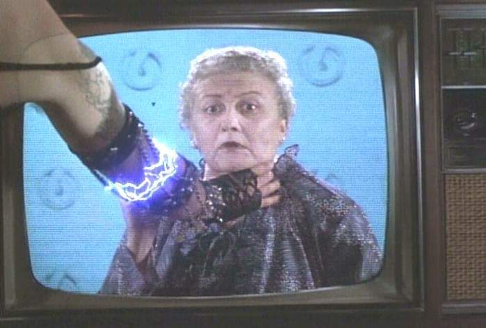 Sneering at everything within a direct line of sight while having his mountainous hairdo constantly buffeted by what looks like Beyonce’s invisible wind machine, Curr boasts some nifty powers that’s awfully reminiscent of Shocker’s Horace Pinker (naughty naughty Wes Craven). Racking up some electricity based teleporting alongside the ability to hold a tune and throw himself nimbly around a stage like Freddie Mercury, Sammi can also shoot lethal bolts from his guitar and can even kill people by reaching into a TV screen and yanking them through from the other side leaving them as an ashy pile. Also, in a moment that’s completely and utterly out of left field, listening to his music has the rather bizarre side effect of conjuring a briefly seen, scaly rape-demon equipped unleashes a tongue so long it would give Gene Simmons a palsy and is oddly nasty considering the rest of the film is fairly good natured. This cool array of talents is bolstered even further by the fact that the film opts to keep Curr a mystery for most of the film (aside from a TV interview early in proceedings we only see him after he’s dead) but you feel that the film would have benefited with a little more screen time from Tony Fields’ charismatic and very physical performance as he struts and stalks around the place like a lycra clad rooster.