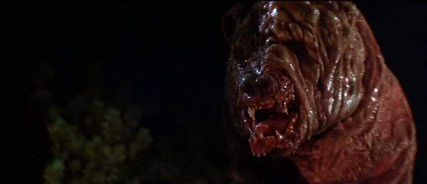 The cast is fairly starry with the aforementioned Armand Assante and Talia Shire being joined by The Thing’s Richard Dyshart and Robert Foxworth (famous for amongst other things, voicing Rachet in the Michael Bay Transformers movies) and despite the fact that Frankenheimer’s balance between drama and horror is way off the last act of Prophecy turns out to belatedly be a far better killer bear movie than the entirety of 1976’s Grizzly with thr director’s eye for glossy carnage coming to the fore as his carnivorous antagonist flips cars, caves in houses and, in one spectacular and unintentionally hilarious encounter, obliterates a child who attempts to hop away while still entombed in his sleeping bag by swatting him into a boulder with such force he virtually explodes in a huge puff of feathers. In fact, the whole final third is such an endearingly po-faced monster mash it almost makes you forget about the preachy, overlong slog to get there with such kick-ass moments as Vern hurling himself onto the bear with a mighty bellow like he’s fucking Thor or something in order to finish off the 20ft beast with an arrow head. The bear itself (named by the Native Americans for a creature from their folklore) is as rubbery as you’d expect but has a legitimately cool design with half of it’s naturally bear-face melting into lumpy, fleshy protrusions – in fact, long time South Park aficionados may find it strongly resembles Al Gore’s nemesis ManBearPig…