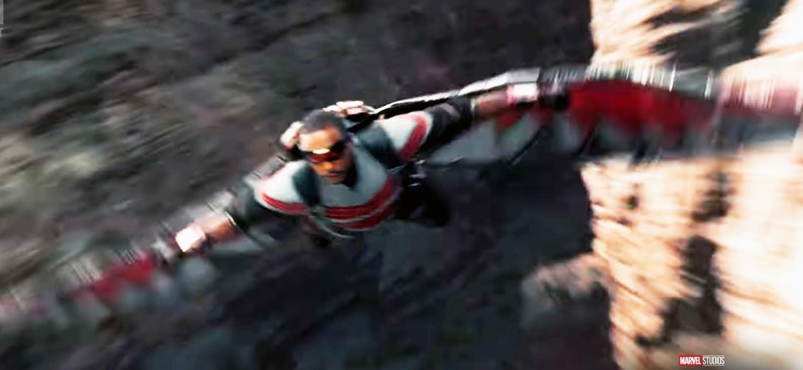 Jumping out of an aircraft while talking to someone is the new superhero landing shot. Falcon does it here but Loki also does it in the trailer for his show. It’s in ‘Iron Man 2’, ‘Captain America: The Winter Soldier’, ‘The Incredible Hulk, and from the footage we have seen it is probably in ‘Black Widow’.