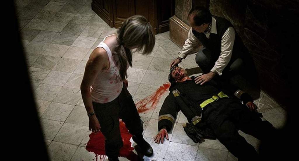 What is going on is that she’s contracted a mystery virus that’s turned her into a bloodsoaked, feral lunatic and she immediately shows her appreciation for being freed by ripping out the neck of one of the officers with her teeth. As they struggle to staunch the blood flow, they discover that the building has been sealed up from the outside by people in hazmat suits and the residents predictably start to panic when it dawns on them that they are both trapped and knee deep in zombie shit. After the old lady claims another victim by launching him off a second floor balcony and having him splat out of nowhere in the middle of the lobby, the remaining policeman draws his gun and tries to regain order but things are rapidly getting out of control. Does the wincingly racist claim from one elderly flat dweller that the Asian family in the building may be responsible for the virus actually hold water? Does a sick little girl only have tonsillitis like her mother insists? And what of the bitten victims, what the fuck is their deal – are they suddenly gonna leap to their feet and start savaging everyone in sight?