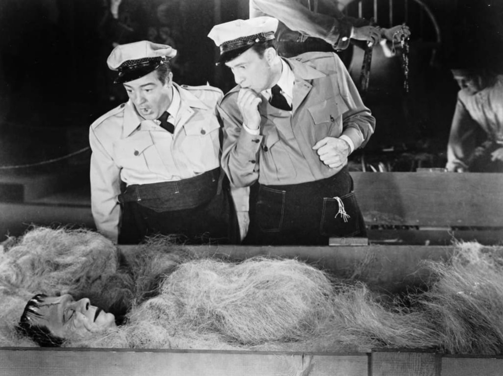 Wilbur Grey and Chic Young are two squabbling cut-ups who work in the baggage department of a railway station who intercept two, large, Universal Monster-sized crates meant for delivery for McDougal’s House Of Horrors exhibit at a local wax museum. While one crate is said to contain Dracula’s actual coffin, the other is stuffed full of the deactivated body of Frankenstein’s Monster and the boys are hired to deliver said items in person (The Creature From The Black Lagoon would presumably turn up via Amazon… get it? Creature? Amazon? Oh, never mind), but it seems that customs has been slacking because it turns out that if they’d actually bothered to check Dracula’s casket, they would have found out that he is still bloody in it! You really can’t get the staff these days…