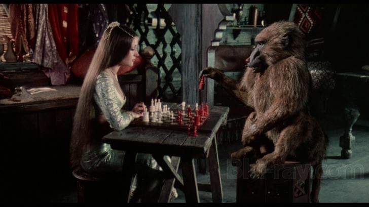 Sinbad (played by John Wanye’s son, Patrick, no less) has arrived at the kingdom of Charrak in order to ask for the hand in marriage of Princess Farah (an absurdly luscious Jane Seymour) from her brother Kassim, who at this point should have been crowned Caliph, but instead has fallen foul of an evil spell. Inconveniently transformed into a baboon by evil stepmother Zenobia, everybody remains thankful that Kasim hasn’t regressed to the point where he flings his shit at people while in a strop, but unless a way can be found to restore him within a certain time, he loses his claim to the crown which passes onto Zenobia’s son. Sinbad, possibly thinking with his penis, volunteers to embark on yet another voyage with Farah and monkey-Kassim in tow to find a way to reverse the transformation by trying to locate Greek wise man Melanthius. In pursuit is Zenobia, her son and a huge bronze minotaur she’s used her hocus pocus to give life to so he can be her dedicated boat version of an Uber Driver (Minoton, five stars!) and she unloads the full range of her ill-defined dark magic to stop her foes dead. As the voyage throws all sorts of obstacles in Sinbad’s path like bug-faced demons and – for some reason – a giant prehistoric walrus (I guess Harryhausen was running out of ideas that day), the crew forges ahead to un-monkey Kassim, but can they possibly succeed in time…?