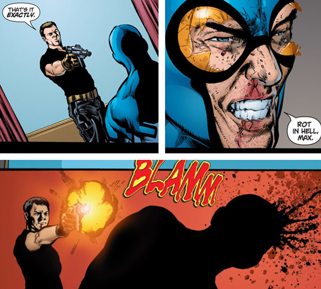 In 2005 Ted starred in the ‘Countdown to Infinite Crisis’ one-shot written by Geoff Johns. He uncovers a plot against the superheroes but his credibility is so low that no-one believes him. Ted decides to go it alone and his investigation leads to the headquarters of the spy organisation Checkmate. His friend Maxwell Lord is running the operation and reveals that he is going to use it to keep all superheroes under surveillance and controlled by him. When Ted refuses Maxwell’s offer to join him Maxwell just shoots him in the face. There’s no villainous monologue giving Ted time to escape, Maxwell just skips straight to murder. Ted gets a ‘To Live And Die In L.A.’ moment which is something you rarely see.