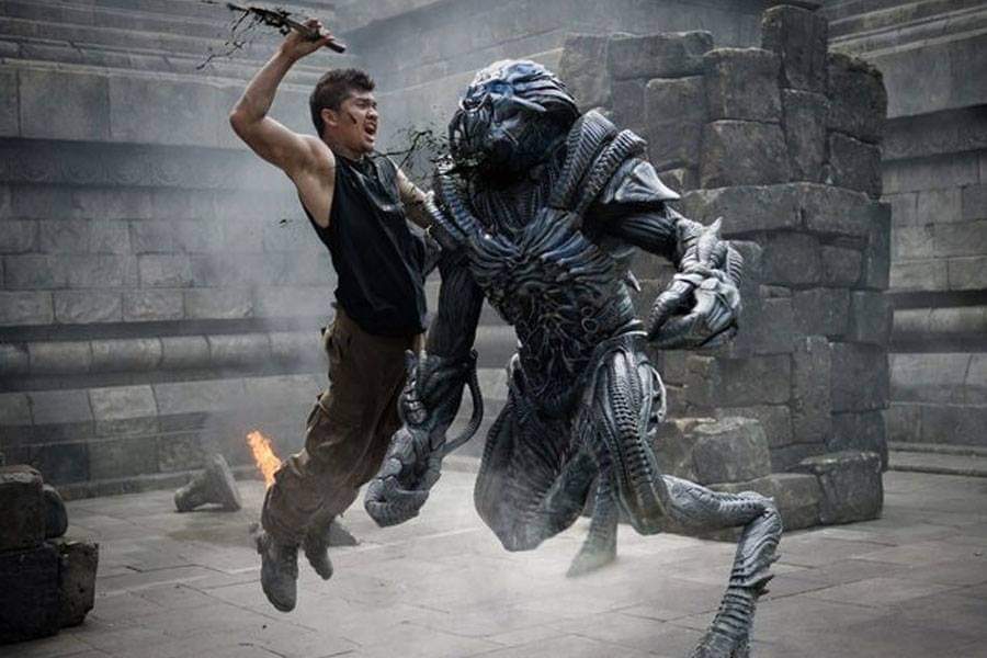 The first thing that works incredibly well is the fact that it “remakes” the first movie by going over it’s events but from the point of view from people who aren’t hiding from the aliens from behind drawn curtains and who are much more proactive, much more interesting and continues to prove the fact that everything gets 45% better when you add Frank Grillo. While the first third of the movie gets you up to speed with the otherworldly shenanigans, the second goes full Aliens as the survivors run around the mothership like they own the fucking place as they frantically tie up the loose threads left over from the previous flick by introducing it’s leads (amusingly recast with actors who look nothing like Eric Balfour or Scottie Thompson) who stick around long enough to pass on some exposition before being ruthlessly cast aside by a script that’s relentlessly obsessed with forging new ground. This takes us to the third section of the movie which randomly decides to drop everyone into Asia and shows that despite their awesome tech, the aliens seem to be suprisingly vunerable to Indonesian martial artists when The Raid’s Iko Uwais turns up and starts dishing out some human-based pain to these alien arseholes. Once a plan has been formulated around some bollocks about getting the blood of Jerrod’s mutant child (dubbed Rose by Grillo) into the aliens machinery we’re off to the races as Grillo, Uwais and and cameoing Yayan Ruhian (The Raid’s unforgettable Mag Dog) beat the living shit out of the invading drones while the head alien and another turned drone have a full on giant smackdown while piloting Kaiju-sized monsters.