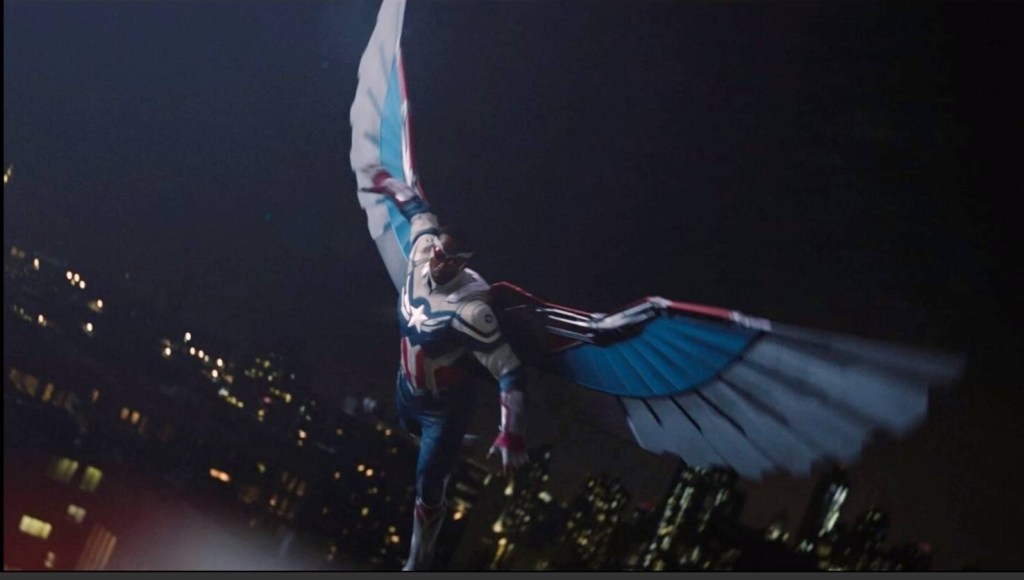 While this is going on Bucky and Sharon are trying to handle things on the ground as Karli becomes more obsessed with making a statement. Sharon starts to show her true colours (?) by melting one of the Flag Smashers and Bucky pursues the vans with the hostages locked inside. At this point John Walker joins the fight looking for revenge on Karli as he as already promised Battlestar’s parents that he has killed his killer. Walker is put in the position where he has to chose catching Karli and saving the hostages and finally he makes the right decision. When the hostage’s van is about to fall of the the road and into a construction site Walker drops his home made shield and grabs onto the van. He is then attacked by the Flag Smashers but has proven he can choose between right and wrong. Sam flies in and completes the save on the van and is again applauded by onlookers. One says “That’s Black Falcon” but is corrected by another who says “No, that’s Captain America”. Again, Sam’s actions are what matters.