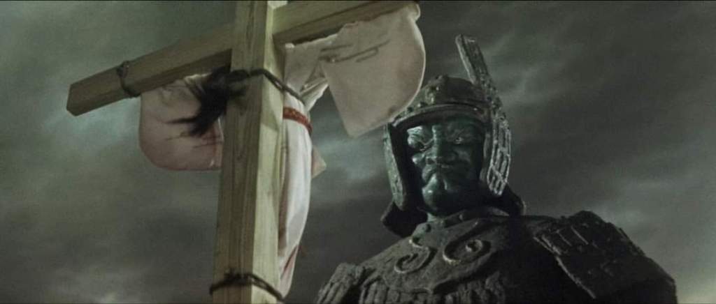 However, with all that being said, some similarities are a little difficult to ignore; both weirdly feature heroes awaiting execution while being tied to crucifixs and both include scenes where the evil lord’s men try to dismantle the religious icon, which leads me to wonder: are these movies, with all their noticable christian iconography an attempt to try and be the Japanese versions of the big budget biblical epics Hollywood was betting the farm on at the time? It’s definately a thought and it makes you wonder what a pyramid-sized Cleopatra would look like stomping through Egypt, hunting for Marc Anthony like a gender reversed King Kong…