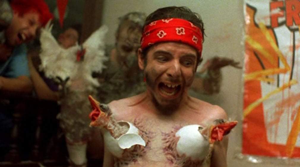 Weirdly, despite the title riffing on Romero and Poltergeist and the basic concept borrowing liberally from any number of zombie films and The Amityville Horror, the movie Poultrygeist most resembles ultimately is the second half of Robert Rodriguez’s From Dusk Till Dawn – if From Dusk Till Dawn featured a scene where Quentin Tarantino shat himself uncontrollably for five straight minutes. The single location and siege plot is a given, but the creatures processed by poultry (and therefore technically are only thinking with their cock) also exhibit weird mutations that vary from creature to creature – not unlike Tom Savini’s illogical but cool tranformation into a rat monster – most just turn into beaked zombies but one guy actually turns into a huge egg and hatches a hulking chicken creature where another grows a sentient elephantine phallus with a face that looks like Dwayne Johnson’s arm palming a basket ball. Yet another thing Poultrygeist has in common with From Dusk Till Dawn is it’s astoundingly gory, showstopping massacre that mirrors the chaos of the bar fight of that tex mex vampire blowout. Simply put, in a movie stuffed tighter chicken’s butthole with endless gore, semen and shit, this scene manages to surpass them all and the gore hound in me has to admit… it’s pretty fucking awesome.