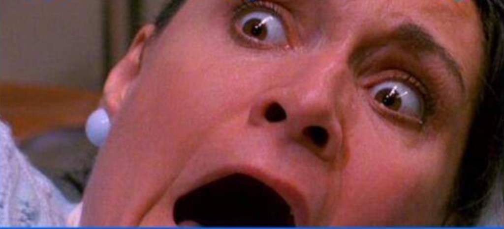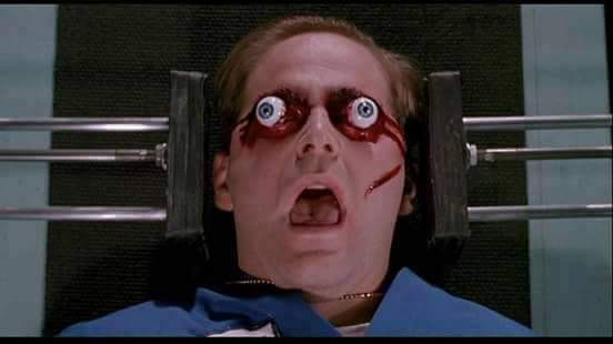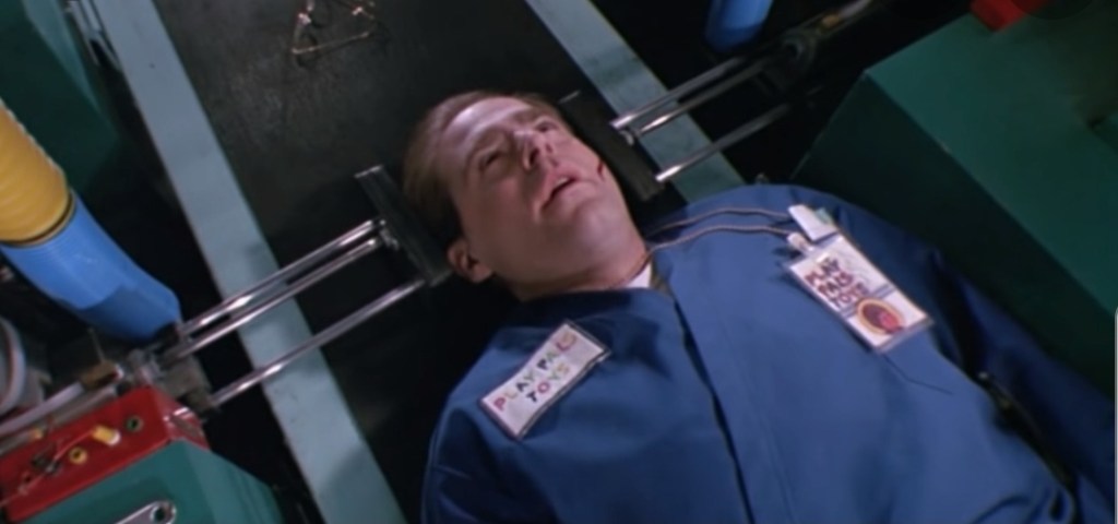 While Chucky stalks little Andy Barclay and abopted sister Kyle around the Good Guy factory, a maintenance guy gets off his rapidly expanding duff to see what all the hubbub is about to clear a blockage in one of the conveyor belts. However, the worker learns the true cost of overtime when Chucky slashes at his face with a knife causing him to fall into the section of the machinery that plonks the eyes into the doll’s empty sockets and before you can yell “Health and Safety” the poor fucker has had his own peepers squishily replaced with the staring blue orbs of a Good Guy. Better make that Date Of Last Accident board back to zero and get the Union rep on the phone, I guess….