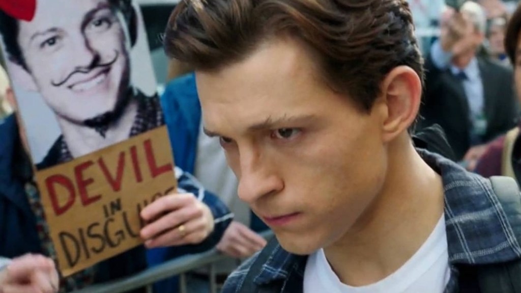 Featuring scenes that carry on immediately where Far From Home finished with J. Jonah Jameson outing Peter with footage provided by a (possibly) dead Mysterio, we get a selection of scenes that show how out hero’s live has spectacularly turned to Spider-Crap as he’s questioned by police, gawped at in school and generally treated like a criminal in the streets. Peter having his identity blown is nothing new in the comics and all feels very One More Day – an infamous arc written by J. Michael Straczynski that saw Spider-Man make a deal with the demonic Mephisto to save Aunt May and restore his secret identity at a terrible cost.