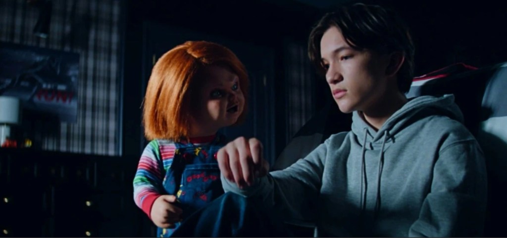 As I mentioned at the beginning, Chucky is finally starting to merge some plot lines that manages to create ongoing drama. Devon manages to accidently locate a tied up Mica who is still having problems with sharing an identity with a fragment of Charles Lee Ray’s soul while Tiffany gate crashes Bree’s funeral with typically flamboyant results while still being bemused that no one recognises that she’s actually Jennifer Tilly. However, benefiting most from this condensing of the cast list is Teo Briones’ Junior, a character who has been a standard moody teen character slowly breaking under the strain of the pressure of living up to his father’s expectations, his mother’s apparent suicide and the fact that girlfriend Lexy is now best frenemies with his cousin, Jake whom he blames for everything. The final straw is the genuinely surprising revelation that Logan actually had an affair with Tiffany years ago which sends Junior into a spectacular rage spiral (it’s the first time I can remember that I’ve seen Chucky used as a murder weapon). Not only has the show finally given purpose to one of it’s more forgettable characters but it also means that’s Chucky’s overarching plan has belatedly born fruit and he’s found himself a new partner in crime and his ecstatic expression as he’s swung through the air as a bludgeon is a peach – also, in a very neat touch, the blood on Chucky’s face mirrors the old scar design from Bride and Seed of Chucky. It seems as Andy Barclay races to confront Chucky, the gore obsessed Good Guy has yet another human counterpart to aid him in whatever the big picture is.