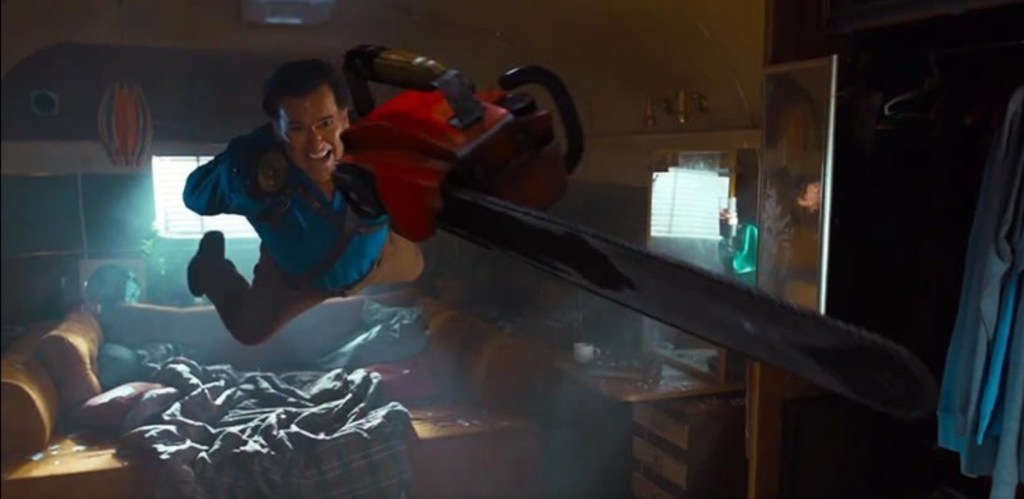 When the news of an Evil Dead series struck me like a self inflicted blow from my own possessed hand, I honestly didn’t know what to think – but when Campbell’s ludicrously chiseled jawline made a confusing cameo in an after credits sting of the far more serious 2013 remake, speculation rose like a Deadite after the utterance of a particular incantation. A self confessed, Evil Dead fanatic (Dead Head, anyone?), I myself was understandably intrigued as to what the hell a show based on Sam Raimi’s deliriously energetic film trilogy could possibly be like: could this new golden age of television hope to do justice to the frenetic style, the overly generous gore and, in Bruce Campbell’s legendarily idiotic protagonist, make Ashley J. William’s as groovy as he always was?