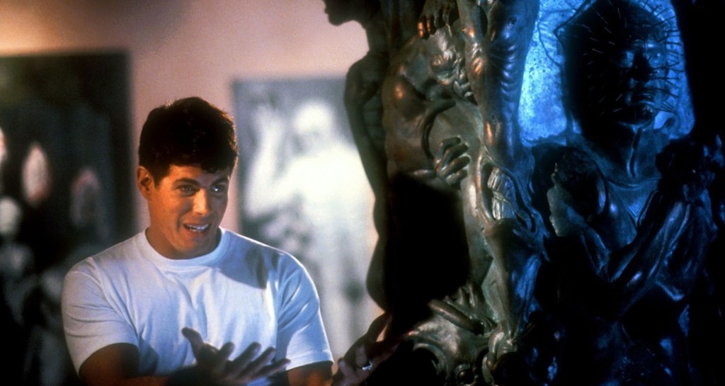 Morals-free nightclub owner J.P. Munroe is not only a walking billboard for rape culture, he’s an unbearably smug art collector too and his most recent purchase is really going to tie the room together. The piece, a giger-esque pillar populated with numerous screaming faces, immediately starts to cause more trouble than it’s worth when a patron of J.P.’s club, The Boiler Room (ugh), gets ripped apart by chained hooks after disloging a familiar cube shaped puzzle box from the ugly structure. Witnessing this grisly version of the walk of shame while trawling for stories at an L.A. hospital is frustrated reporter Joey Summerskill, who decides to go after this “story of a lifetime” (man dies in hospital? What a scoop!) by tracking matters back to The Boiler Room and J.P.’s ex-girlfriend Terri. However, a strange death will be the least of everyone’s problems when, after a freak bleeding accident, it’s revealed that pillar contains the demon half of the Cenobite known as Pinhead who was separated from Elliot Spencer, his human side, during the events of the previous movie and the resurrected creature makes a typically faustian pact with the unscrupulous J.P.: free him and be rewarded.