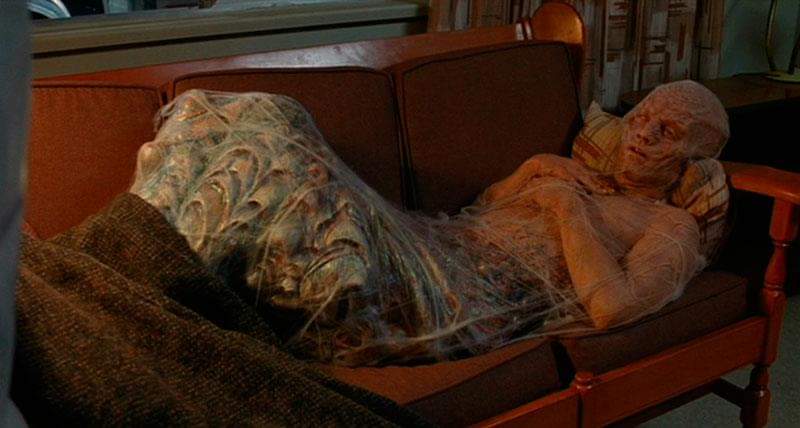 After being born from a Veronica Quaife who suspiciously looks only vaguely like Geena Davis, the son of Seth Brundle is expelled in the form of a lumpy cocoon that causes its mother to expire during the extraordinarily tough childbirth, however, once the fleshy lump is cut open, the scientists at Bartok Industries find that inside is a perfectly healthy looking baby boy. The child, named Martin, isn’t exactly what you’d call normal though and as well as advanced intelligence, the bug born baby come complete with some accelerated aging to contend with that causes him to grow into Eric Stolz within five years.