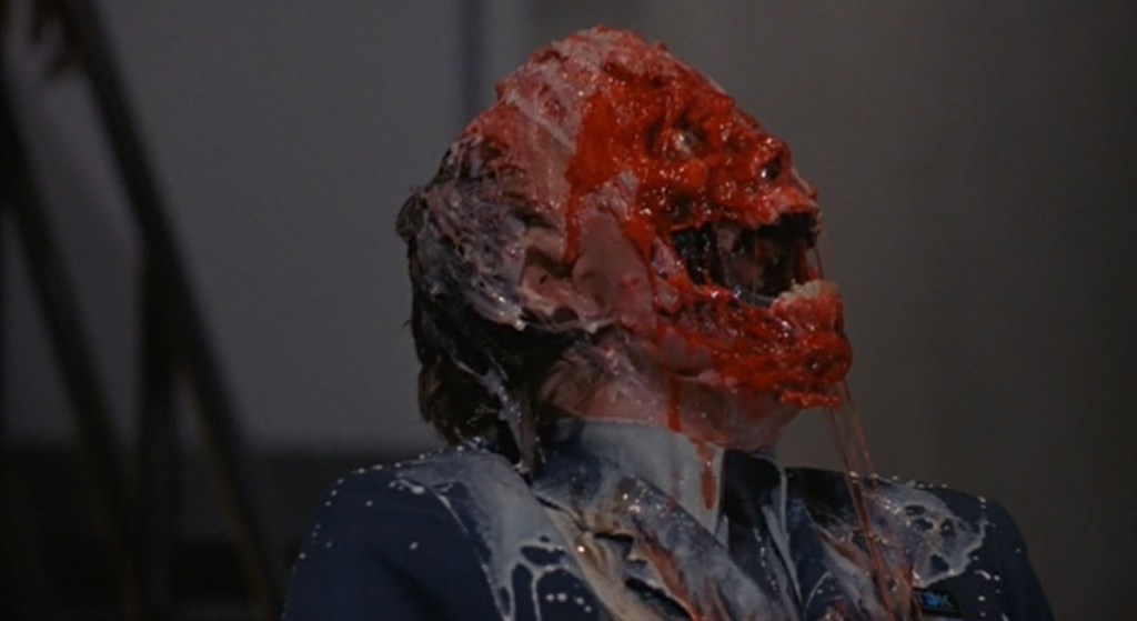 However, once Martin has fully transformed and busted out of his cocoon to crack the skulls of some egg head scum, the film finally upshifts into a monster on the loose movie that sees this new Brundlefly (which while admittedly looking fucking cool, slightly resembles a four armed crocodile more than a fly) snapping spines and choking nerds left, right and centre. In fact, during the finale, Walas actually almost tops the gore highlights from the previous movie by matching a vicious compound fracture and limb dissolved in fly vomit and raising them by featuring an insanely satisfying head crushing by elevator and a truly horrific fly vomit facial which goes precisely the way you’d expect.