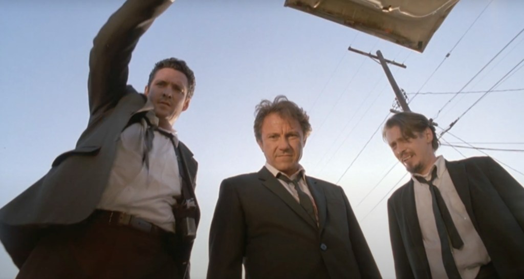 Elsewhere, the ridiculously self-assured, first time director leads the film with an embarrassment of iconic moments that remain indelibly burned on the sub conscious decades after it made its premier. Seriously, they’re almost without number – the slow motion walk to Little Green Bag by the George Baker Selection, the ear slicing torture scene set to Stealer’s Wheel’s Stuck In The Middle With You, Keitel and Buscemi pointing guns at each other, the shot looking up from a car trunk – for a film obsessed with pop culture, it certainly helped add to it…