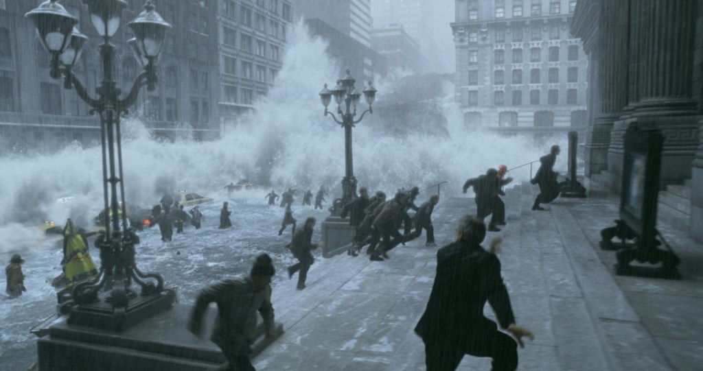 Jack Hall is a respected paleoclimatologist and a failed father, but one day, while drilling for core samples, a humongous section of the Larsen Ice Shelf just suddenly breaks off like a soggy cracker. Needless to say, this isn’t usual behavior, so after some scientific digging he appeals for action at a UN Conference only to be heckled by none other than the highly dubious Vice President who decries Jack’s findings as mere sensationalism. However, soon more and more extreme examples of weather start to make their presence felt; basket ball sized hail stones brain hapless civilians in Tokyo, gargantuan hurricanes erase the Hollywood sign in LA and super storms aceoss the globe are building that pull frozen air down from the troposphere to flash freeze literally everything caught in the eye. While the various human cast scrambles to get the word out and save lives (like trying to evacuate everyone from the Southern states of America into Mexico), Jack’s estranged son Sam is caught in Manhattan when a giant tsunami traps him, some of his class mates and other various survivors in the New York Public Library. However, this proves to create an even stickier situation as a sizable chunk of the planet is about to enter a new ice age and so Jack and some buddies grab their equipment and trek, by foot, to New York for an ill-advised rescue mission to save his son who doesn’t have long until the next super-freeze turns him and his friends into really creepy ice sculptures unless their taking shelter.