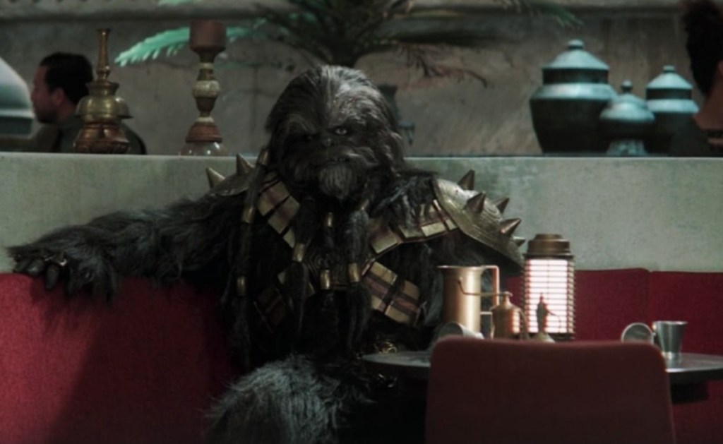 Fennec tells Boba that the mayor is still missing and the Pykes are gathering so he heads into town to show his face. This leads to the first scene on the show that I think won’t have any meaning to casual viewer. Krrsantan is drinking at the Sanctuary and getting more and more wound up buy the partying Trandoshans on the next table. He explodes in a fit of rage, throwing them all over the bar. Garsa Fwip (Jennifer Beals) tries to talk him down but he ends up ripping the last one’s arm off, something we have been aware that Wookiees do since the first film. To the casual this is just an angry Wookiee but for those with knowledge of deeper Star Wars lore this is a response to a centuries of the Wookiees being hunted by the Trandoshans for sport. Also, Trandoshans can grow they limbs back so the act of ripping was just for show. Outside the bar Boba continues to grow his tribe by giving Krrsantan a simplified version of the speech he gave Fennec.