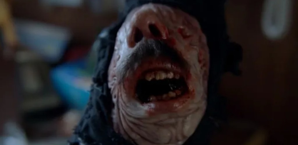Another massively successful aspect of the episode is the long overdue pairing of Kelly and Brandy as Ash’s daughter gets some hard truths from Ash’s sort of surrogate daughter and this point is driven home by the fact that once again, the insanely game Dana Delorenzo gets to indulge in some Campbell-esque abuse for the first time since she squared off with killer hand puppet Ashy Slashy in season 2. Here, she manages to fend off a kamikaze Pablo as he hurls himself through her windscreen and sinks his demonic gnashers into her leg only for her wound to later mutate into grotesque version of Pablo’s nose and mouth (and even his moustache) that can allow him to communicate to his horrified would-be victims. Deranged body-horror aside, it’s nice that Brandy is finally getting some counter views about her monumentally flawed old man – even though Kelly starts her argument by admitting he’s a perverted drunk with racist tendencies – and it puts the spotlight back on Kelly coming into her own as a ferocious Deadite slayer of some repute. Seeing her stride around in her torn jeans/leather jacket/machine gun combo is always a good thing, but it’s vital we see her get down in the muck and go through some real Evil Dead-style suffering to earn her stripes. On a similar note Ray Santiago gives great Deadite and the fact that her best friend is trying to kill her and the moral conundrum maybe her greatest test to date.