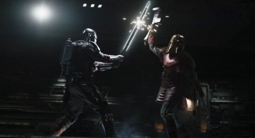 The other great thing about Favreau’s Star Wars is he isn’t afraid to show things and make logical jumps in the story. There is no “somehow Mandalore fell”, we’ve be told about it in ‘The Mandalorian’ and here we see it in all it’s Terminator-esque glory. Din needs to learn how to use the Dark Saber and the episode takes the time to show him being trained by the Armorer. The other Mandalorian is Paz Vizsla, descendant of the creator of the Dark Saber, and he believes it belongs to him and challenges Din for it. Din wins but the Armorer declares him unfit to be a Mandalorian as he has taken his helmet off and the only way he can be purified is in the waters underneath Mandalore. This is all set up for future adventures as he now has a new quest. It has also become clear that Din’s belief in the Armorer’s extremist views has been shaken and there are now more important things in life to him.