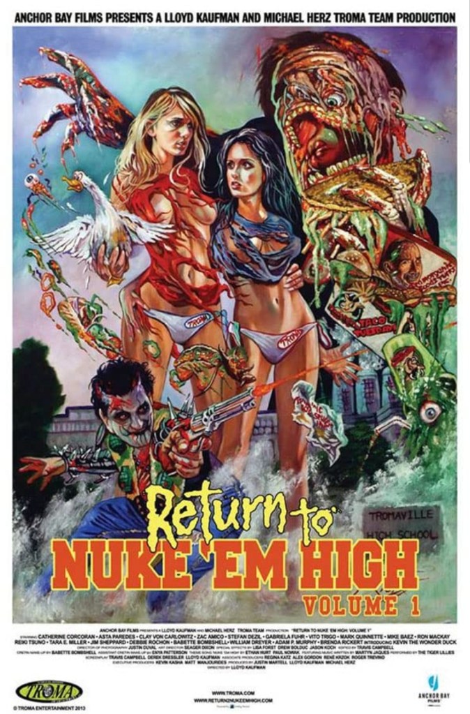 There’s some filmmakers working on the fringe of movies today that I would throw myself on barbed wire if it meant it would protect their freedoms to continue making films the way they want – however, that doesn’t necessarily mean I like everything they make. Take Lloyd Kaufman, the mad professor who’s been the face of New York based independent studio, Troma, for decades now, who, with partner, publicity-shy Michael Herz, have peddled their particular brand of randy, gore-comedies (plus numerous horror low budget titles released under their banner) despite bigger studios trying to quash their spirit. While they’ve knocked it out of the park in the past with genuine trash classics such as The Toxic Avenger and Class Of Nuke ‘Em High, other titles sometimes get drowned in Troma’s desire to be as cartoonishly crass as humanly possible, while others nestle oddly between the two. Behold the belated return to Nuke ‘Em High.