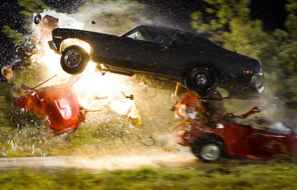 Still, just because his plot is somewhat ungainly, it doesn’t mean Quentin doesn’t bust out the odd exemplary moment during the film. Vanessa Ferlito is great as Mike’s initial target and as Mike himself, the immortal Kurt Russell does superlative work with a rare villain turn as he uses his powers of easy charisma for evil. On top of that, QT gets to flex his talent for dialogue in a very subtle way by having the two separate groups of girls having very similar discussions, but having them in noticably different ways. The first, younger, group are far more immature that the older, second, more likeable group who are more pragmatic about men and their peculiar quirks and seem to have their lives far more together than the earlier cast who are destined to become a crimson smear on the hard top. Ah yes, the car stuff… The casting of Zöe Bell (Uma Thurman’s impossibly perky stunt double from Kill Bill) means the scene where she’s actually dangling from the hood of a speeding car is 100% legit and the subsequent car chase is endearingly CGI-free. However, the jewel in Death Proof’s slightly wonky crown is the show stopping car crash that ends the first half that’s quite unlike anything that’s been seen before. With the tension built up to an unbearably degree thanks to the masterful use of Hold Tight! by Dave, Dee, Dozy, Beaky, Mick & Tich, Tarantino replays the apocalyptic smash over again from the point of view of everyone in the victimized car with the results being a severed leg twirling majestically through the air and a face being ground to mush by a passing wheel.