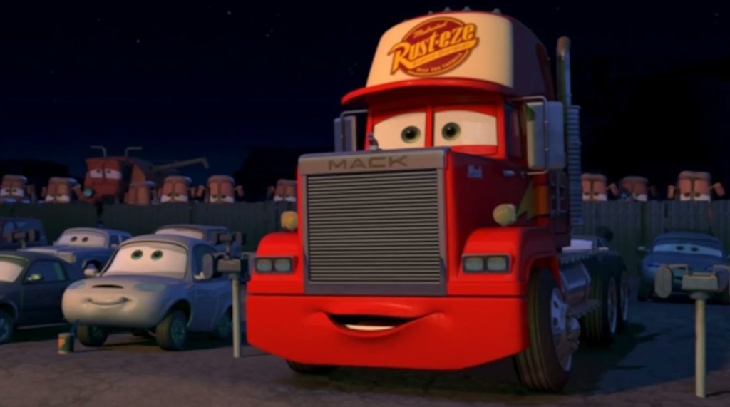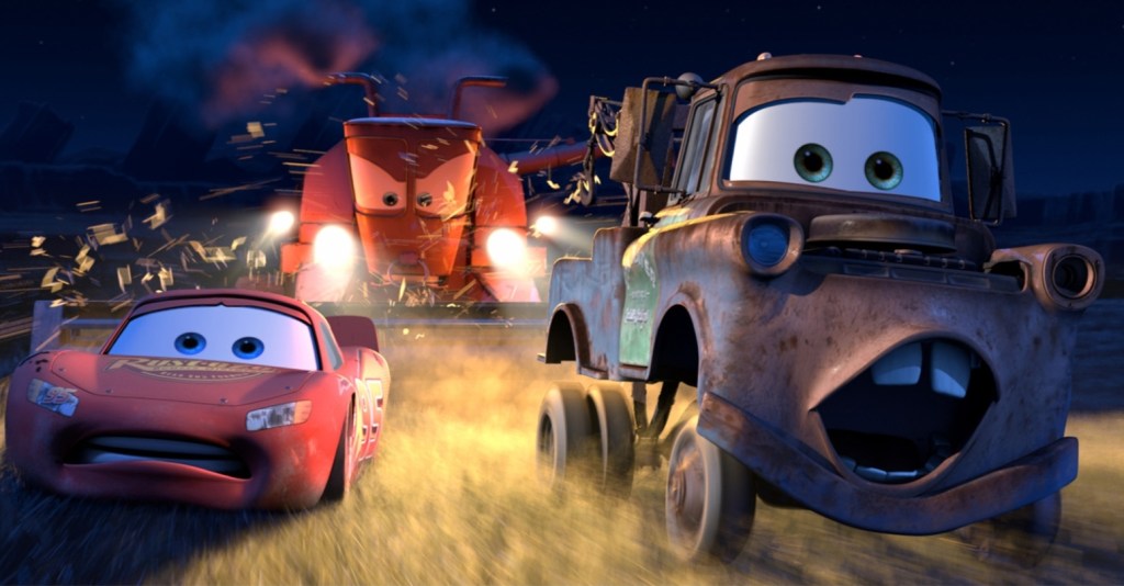 While he slogs away, dragging along the massive, tar spitting, road paving machine McQueen slowly bonds with the locals and notices that they are hanging onto the town’s livelihood by a thread, but they also gets to hang out with rambunctious local tow truck Mater who shows him the simple pleasures of cow tripping and other country pursuits.