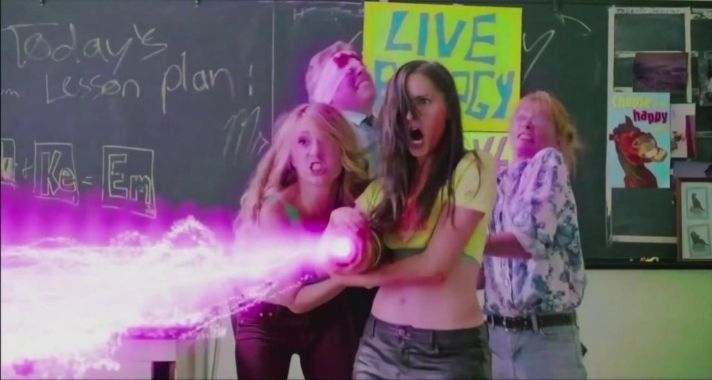 Meanwhile, Lee Harvey Herzkauf’s insidious plan is finally revealed when we find out that he’s been selling contaminated tacos to students in order to harvest them to smell their farts and become immortal (I said it was insidious, I didn’t say it made sense) and this apparent Fart-tain of youth means he has surprising ties to the original movie. Elsewhere, Lauren’s lost pet, Kevin The Wonder Duck wanders into Tromorganic Foodstuffs Inc., finds his way into a barrel of chemical waste and is promptly mutated into a hulking, humanoid fowl-monster that makes his way back to the school for some violent packback against the Cretins. Finally, speaking of the Cretins, after amassing an army of like-minded maniacs with beef scented nerd Zack among them, the deranged ex-Glee club launch an assault on the school while singing songs strictly in the public domain. Will anyone survive the chaos? Fuck that, how about will any of it make sense?