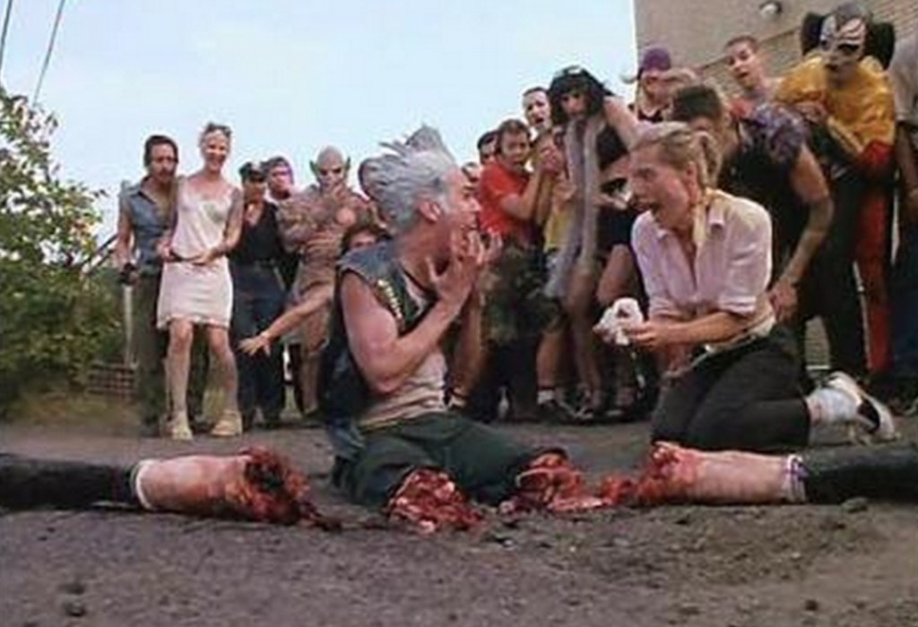 Terror Firmer is unlike any other movie Troma has ever released before – well now, no, wait… that’s not entirely true, it’s exactly like other movies Troma has released before, but lodged in among the cheap jokes, ratty gore, copious male full frontal nudity and endless crowd scenes of people acting like idiots, it seems Lloyd Kaufman actually has a few things to say. Troma has always taken obvious swings at corporate America and politics ever since Kaufman and partner Michael Herz first stepped behind the camera and started making weird movies instead of distributing them, but here the director has turned his sexually deranged, gore comedy into an abnormally strange, yet genuinely impassioned plea to save truly independent cinema. It’s a subject that obviously means the world to our cheeky auteur and while it’s delivered with all the tact of acupuncture being performed with a javelin, it’s still nice to see Troma trying something with a little more substance than just jiggling boobs and fat guys with micro penises.