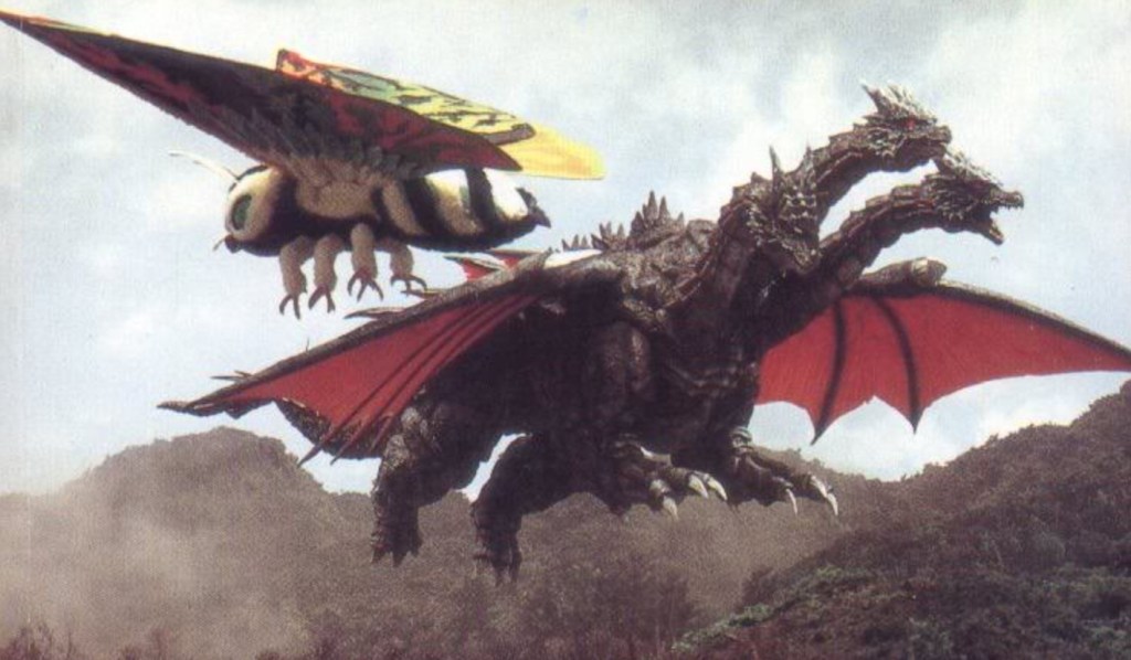 A logging company discovers a massive subterranean prison while they ravage the local woodland and before you can say “giant three-headed space dragon”, Yuichi, one of the workers, inadvertently breaks the seal and takes it home to make a necklace for his screeching daughter. This turns out to be an impressively bad move as the prison contains the monstrous Desghidorah, a destructive force that was subdued millions of years “before time” by a species of highly advanced moths who acted as guardian to the diminutive, doll-sized race known as the Elias. Before you accuse me of banging out this review while downing a bottle of absinthe, know that things get even weirder: the last of the Elias are the kindly Moll and Lora, who watch over the last remaining moth, Mothra who lays a single egg to continue her line. However, Moll and Lana’s sister, the spiteful Belvera who will stop at nothing to destroy everything because…. uh, villain reasons?