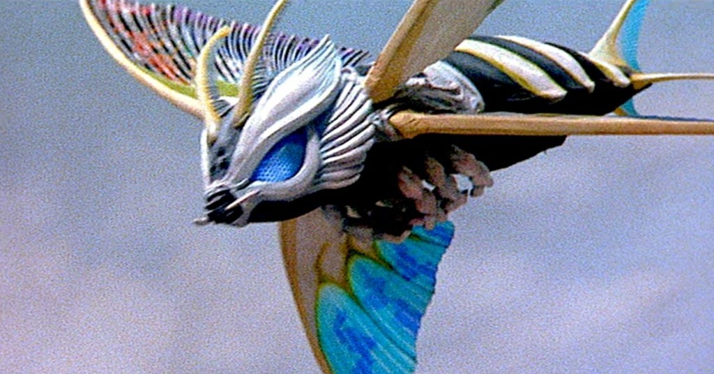 While given a decent antagonist to wrestle with (Daghara is a giant lizard with a manta-ray back and mortar launchers in his shoulders), the main problem is that Mothra himself simply has no plot to work with and is relegated to simply showing up when needed, no questions asked and while this was never an issue for Godzilla during his 70’s, superhero phase, you feel as a benevolent earth god, Mothra should warrant more respect from his own movie. He (never gonna get used to calling him “he”) even gets to change form into the ultra sleek Aqua Mothra in order to fight the submerged death-lizard in his own turf, but this is something that just kinda happens, like Super Mario sprouting a racoon tail or wearing a frog suit to swim. The fact we have a Kaiju who can adapt its body to any threat is a truly mouthwatering concept, hinting that our antenna-ed hero has any number of alternate forms when it’s required to go on the offensive, but its sadly glossed over as Leo Mothra is shoved rudely into the movie’s B-plot.