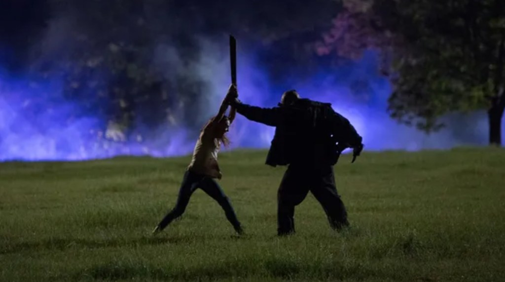 While their reactions range from disbelief to elevation (horror nerd Duncan is ecstatic), the group soon realise that they’re going to have to play along with the movie’s plot if they’re ever going to make it back to the real world and start getting to know the air-headed, vapid slasher stereotypes that are killing around the camp. Max makes a bee line for Nancy, the character her mother played who is destined to get slaughtered on a water bed minutes after losing her cherry to insipid alpha male Kurt and immediately tries to convince her otherwise. But due to their meddling, the wrong kids start dying in the wrong order at the hands of vengeful, hulking, disfigured, slasher Billy Murphy and soon the entire plot is an utter mess with the movie’s established “final girl” immolated in a car crash. With the original virginal heroine charbroiled to a crisp, that leaves Max and Nancy the only virgins left to kill the slasher in the final reel, but movie lore dictates that there can only be one survivor – can Max stand to lose her “mother” one more time in order to live?