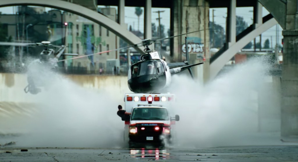 In a desperate financial situation due to his wife’s escalating medical bills, war veteran Will Sharp is coaxed into being part of a high stakes, LA bank heist by his adopted wild card brother Danny. Of course, Hollywood lore dictates that everything will spectacularly fly of the rails due to a random, unforeseen wrinkle that manages to reduce the plan to FUBAR – so allow me to introduce rookie cop Zack who stumbles into the tense robbery because he has a crush on one of the bank tellers. Before you can say “everything gets fucked up”, everything gets fucked up and after the bullets have started flying, Danny’s crew are demoted to bullet riddled corpses and Zack has managed to catch some lead himself. Desperate to not have a dead cop on their hands (especially in LA), Danny and Will hijack an ambulance crewed by talented, but emotionally closed off EMT Cam Thompson whom they demand at gunpoint to save Zack’s life as they speed off through streets in order to make their getaway.