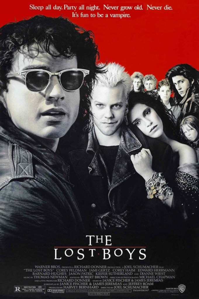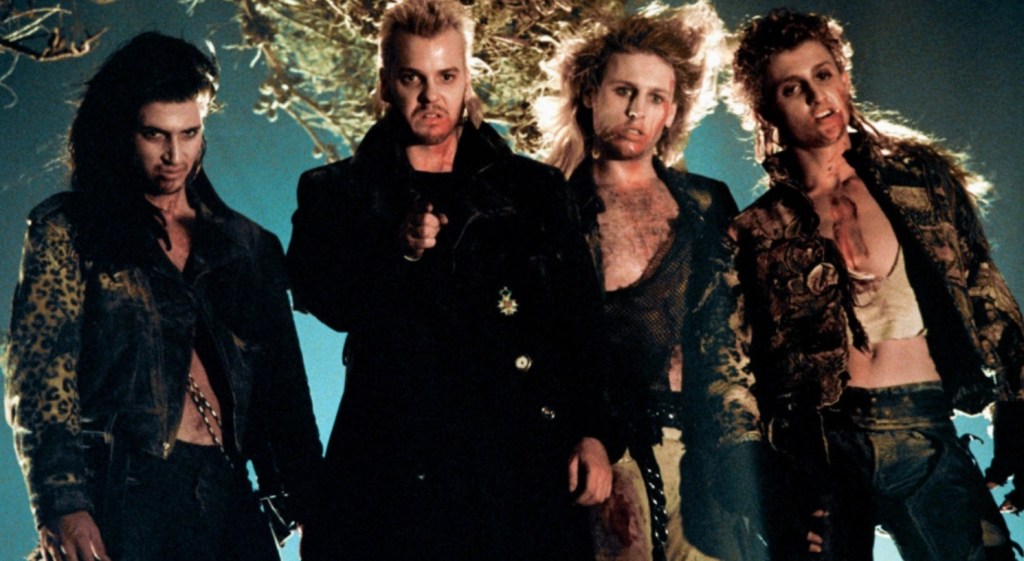 After a messy divorce, Lucy Emerson and her two sons Michael and Sam are forced to move to the beach front wasteland of Santa Carla, California to stay with her crusty old taxidermist father until she can get back on her feet. As horrified as the boys are with this development, their mood hardly improved by the news that Santa Carla is the murder capital of the world, but this hardly dampens their spirits when they head out that evening to sample the spirited nightlife. While the younger Sam meets the decidedly odd Frog Brothers who runs a local comic book store and Lucy gets a job with kindly video shop owner Max, Michael becomes infatuated by Star, a pretty girl he spots walking the boardwalk and follows her despite literally being told about the murder rate an hour or so earlier. It turns out the Star rides with a quartet of ludicrously fashionable (for the 80’s, anyway) dudes led by the enigmatic David, who first tests Michael and then tries to induct him into his gang with the catch being that under their immense amounts of hair product and chains, they’re actually vampires.