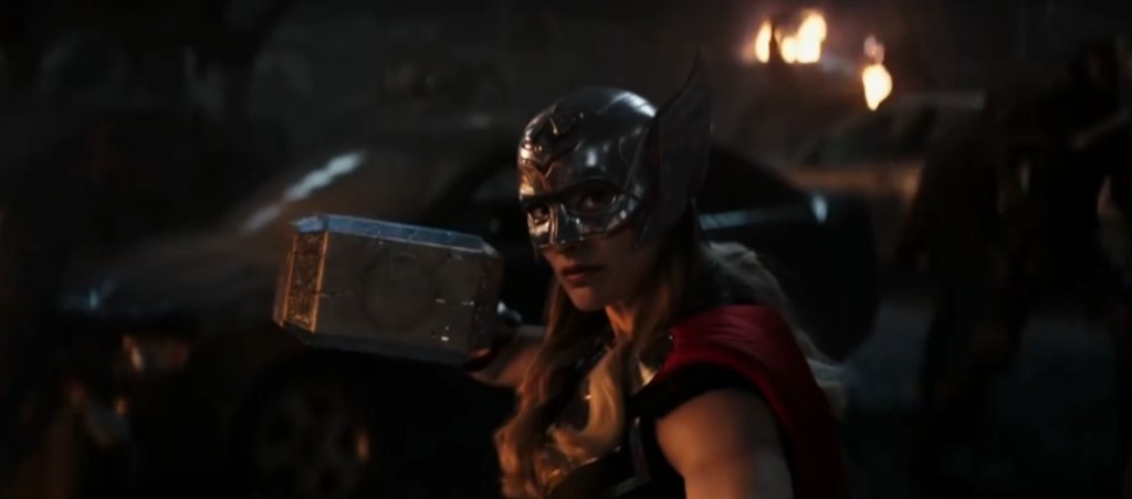 Here she is. Natalie Portman’s return as Jane Foster reborn as The Mighty Thor as she wields a reforged Mjolnir with noticably bulging arms.