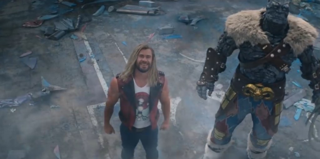 While Christian Bale’s big bad, Gorr The God Butcher is a no-show in the teaser, his handy work is more than evident by a shot ripped right from out of the pages of Jason Aaron and Esad Ribic’s magnificent God Butcher arc as Thor and Korg gaze upon the ruined corpse of Falligar the Behemoth.