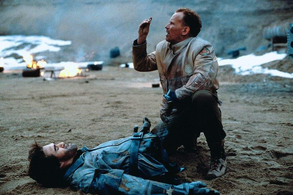 Elsewhere, the movie crams in other random sci-fi ideas that feel equally half-baked; corporations waging literal war on their rebelling employees screams the lack of a good union in the future and in order to negate the radiation poisoning hanging in the air, people have to periodically puff on special, red cigarettes (“I can’t believe you have to put this shit in your lungs to neutralise the shit in your lungs.”) – but Screamers is still one of those movies where the time period is distant enough for people not be used to stuff like classical music, but still use contemporary era slang.