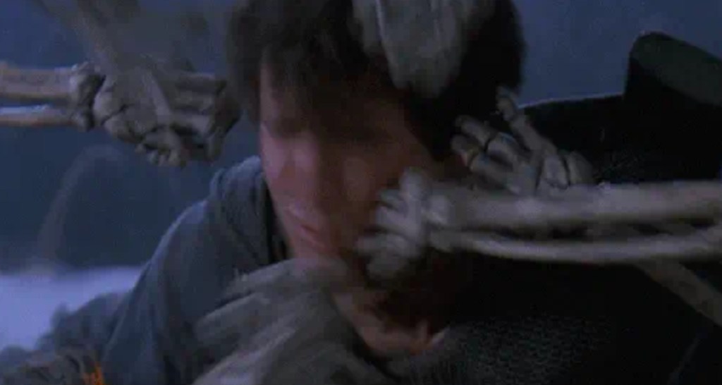 If (rare) moments of The Evil Dead revealed Raimi’s capacity for subtlety, trilogy capper Army Of Darkness showed us what he could do if in a really silly mood and things don’t get much more endearingly stupid than this. After failing a multiple choice test twice when having to pick from three identical Necronomicons and then bungling the incarnation needed to safely swipe the evil book from its alter, Ash inadvertently causes an entire graveyard of skeletons to resurrect and lay down some serious, Three Stooges-style hurt on our dim witted hero. As he sprawls screaming on the ground, numerous bony arms soring from the ground and start performing various slapstick skits on him like slapping him across the face, fishhooking his nose and mouth with their probing digits and attempting to poke him in the eyes.