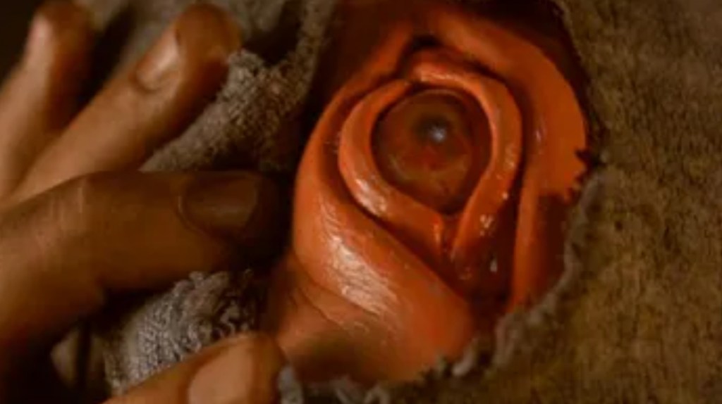 Due to the various edits of Army Of Darkness that emerged in the wake of its distribution hell, this scene has numerous alternate versions – fitting considering that Raimi’s Doctor Strange movie also deals with variants of staple MCU characters – but in the most complete version you can find (I’d go with the old Region 1 Director’s Cut DVD for best results), we join Ash, stranded in medieval times while fighting off nasty little miniature versions of himself as they jab him with forks and cause him to slam his face onto an extra-hot stove. He eventually ends up swallowing one of the tiny buggers and it takes root inside and eventually grows another, eviler, full-sized Ash that sprouts out of the original’s side and finally breaks off to square up to our bemused hero.