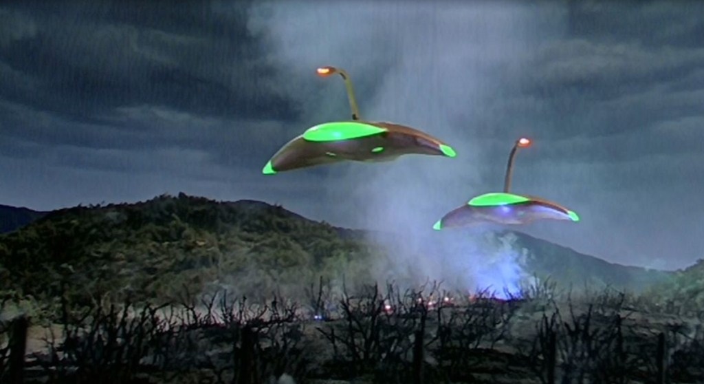 However, as he starts to theorize about the meteor while taking time out to woo pretty science instructor Sylvia Van Buren inbetween, the smoking thing opens to disgorge a large, silvery manta ray looking thing that unleashes hell from the heat ray that explodes from a protruding antenna. It turns out that it’s a Martian war machine and as two more craft emerge from the meteor, reports of other strikes come in from around the globe as these intergalactic invaders indulge in their M.O. of obliterarate first, ask questions never.