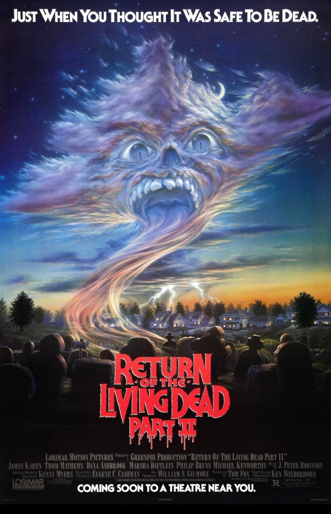 A resplendent example of this are the nihilistic belly laughs of Dan O’Bannon’s punk-rock, zombie-fest Return Of The Living Dead, a doom-laden, sarcastic reworking of the scenario’s seen in the seminal works of George Romero that draws cruel humor out of its merciless treatment of its youthful, disenfranchised characters as they’re swamped by brain eating ghouls revived by a mysterious gas. To sequelize such a movie was to surely court disaster (especially considering that the first movie ended with the military solving everyone’s problems by dropping a bomb everyone in the affected area), but in 1988, filmmakers attempted to do just that with mixed results.
