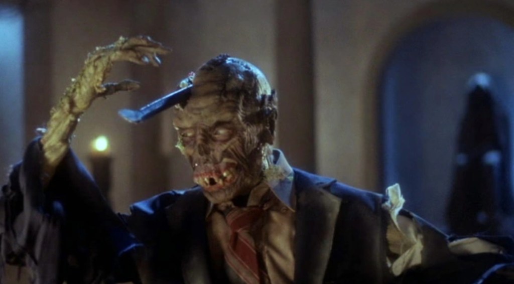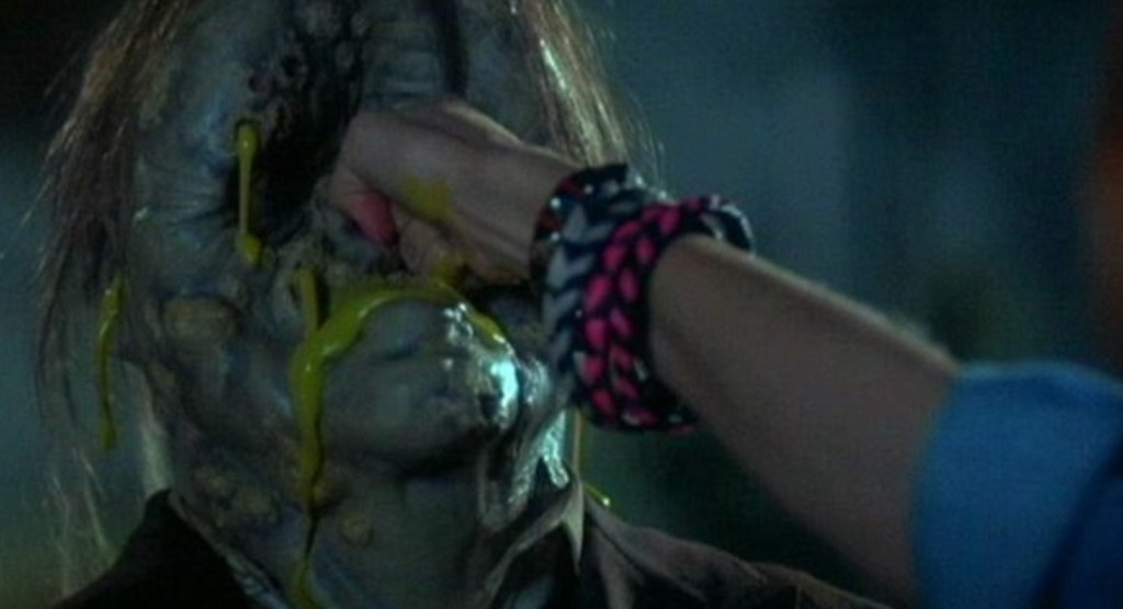 Of course, despite all the movie’s flaws, it’s relatively redeemed somewhat by some truly impressive zombie effects (it was the 80’s after all) that sees jaws messily pulled off, faces squished and, most impressive of all, a scene where a zombie is shot gunned in half and its legs wander off while its top half vainly grab for them.