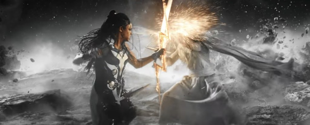 Anyone afraid that Tessa Thompson’s newly crowned King of Asgard was going to spend the movie sitting on her duff and moodily governing the day to day rule of her kingdom can now rejoice as the trailer reveals a far more active role for Valkyrie; aka. Scrapper 142. Shown whizzing around on her flying horse and getting stuck in fighting Gorr himself while wielding what looks like one of Zeus’ thunder bolts, she seems to spark up something of a rapport with Jane Foster which has lead to some theorizing that maybe the “Love” in Love & Thunder may necessarily not be between Thor and Jane…